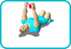仰向け足あげ両手を伸ばした状態で床に仰向けに寝ます。両手を足の方向に振るのと同時に、片方の足を高く上げます。左右の足を交互に行います。 |