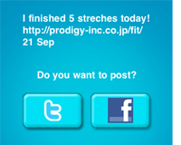 http://prodigy-inc.co.jp/fit/ 18 Sep」などと、twitterやfacebookに投稿することができます。友人たちに宣言することで三日坊主にならずに続けられるかもしれません。